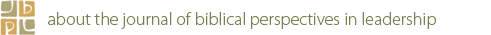 The Journal of Biblical Perspectives in Leadership (JBPL) is a refereed scholarly journal that aims to provide a forum for international research and exploration of leadership studies focused on the Hebrew and Christian scriptures.