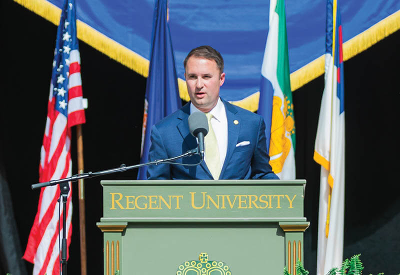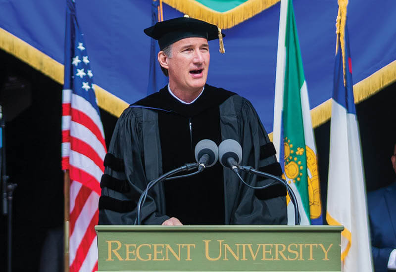 He continued, “I want to talk about the world that awaits you, a world that needs you because you are graduating from Regent University, and you will change the world. … There are always seasons of tribulation that go with seasons of triumph. Just remember, there are no diamonds made without pressure. … What’s most important in those moments is that we remember two very important tools. First, mentors who can guide us and advise us, and second, a compass. A compass that points us in the direction of sacred truth. A compass that points us in the direction of core values that define us.”