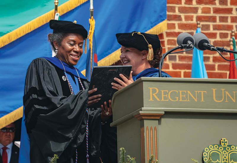 Regent’s 42nd Commencement Weekend officially kicked off two days earlier with commissioning services, where faculty and administrators prayed over the graduates, recognized their accomplishments, and handed out diplomas.