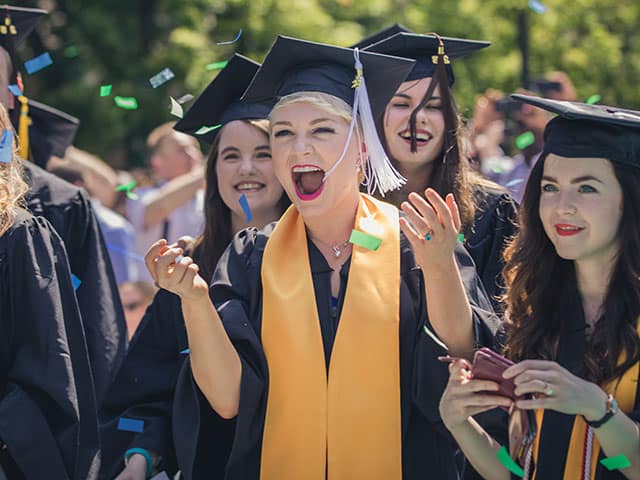 Regent University graduates smiling with confetti falling on -campus in Virginia Beach.