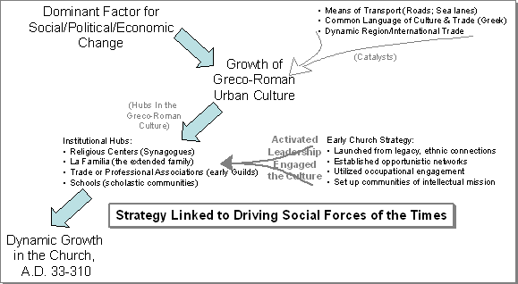 The institutional driving force for change in the first century was the Greco-Roman city. The Early Church tied its strategy to this driving force and effectively targeted the dominant institutions of the Greco-Roman cities (See Figure 1). Roman cities, particularly in the eastern Roman Empire, became the incubator for the Early Church in its mission to spread the Good News and its revolutionary set of values, even if at times their welcome was not entirely friendly.