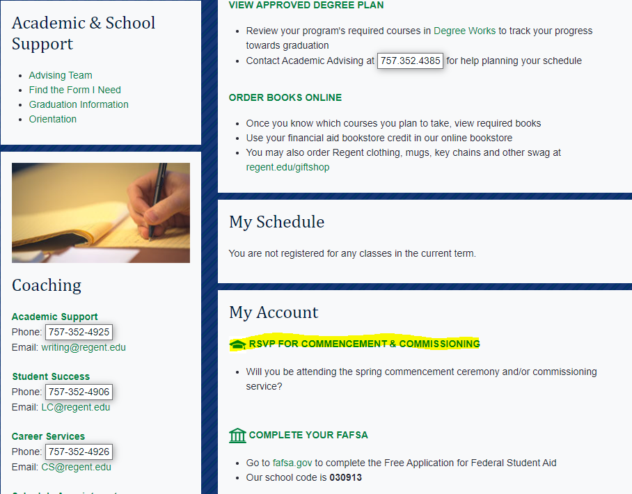 Students are required to RSVP for both the Commencement Ceremony and the Commissioning Ceremony. Once approved to do so by the Registrar, within the RSVP window from February 10 – April 13, 2025, the following link will appear in the MyRegent portal (not GENISYS). Students must log into their MyRegent portal, select the Student tab at the top of the portal, and scroll down slightly to locate the below RSVP for Commencement & Commissioning: