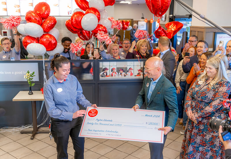 Peyton Edwards receives a $25,000 scholarship check from a Chick-fil-A executive, surrounded by cheering employees and red and silver balloons.