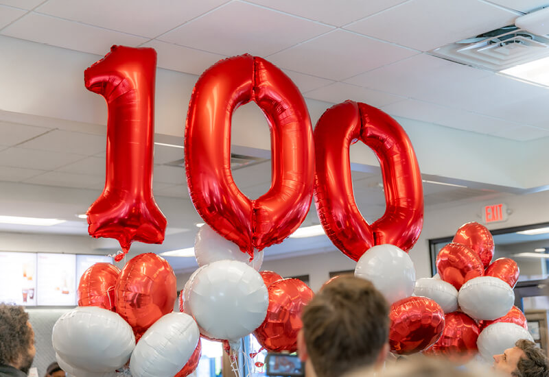 Large red and white balloons spelling out '100' float above the crowd at the Chick-fil-A scholarship event.