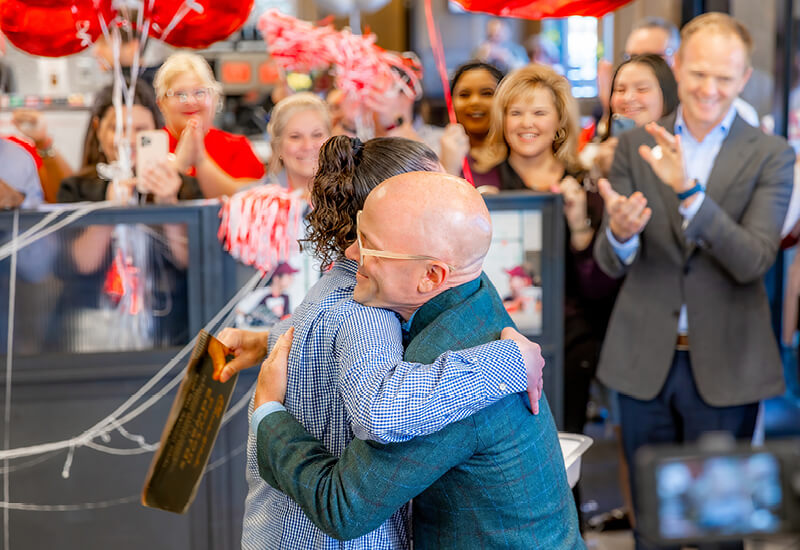 Peyton Edwards embraces a Chick-fil-A executive in an emotional moment while the crowd cheers and claps.