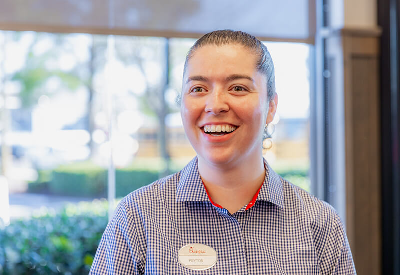 Peyton Edwards beaming with joy, wearing her Chick-fil-A uniform, with natural light shining through the windows behind her.