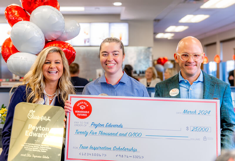 Peyton was dumbfounded when she recognized Chick-fil-A CEO Andrew Cathy. He then gifted her with kind words, a new laptop, and an oversized check for $25,000, declaring her a True Inspiration™ Scholar.