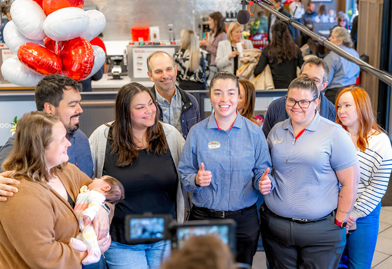 Peyton Edwards stands among her family, friends, and co-workers, smiling and giving a thumbs-up in celebration.