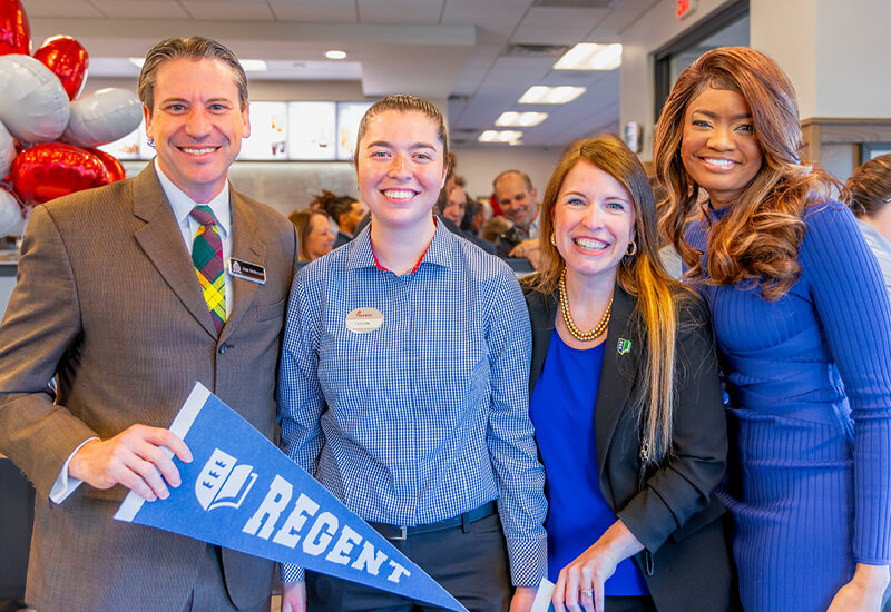 Peyton Edwards posing with Regent University representatives, holding a Regent pennant while standing in front of a festive Chick-fil-A backdrop.