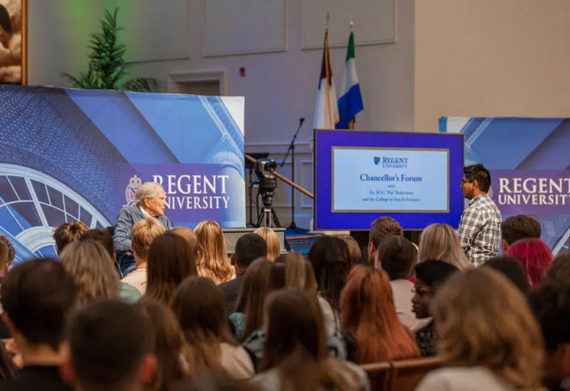 VIRGINIA BEACH, VA (Aug. 23, 2022) – Regent University Founder, Chancellor & CEO Dr. M.G. “Pat” Robertson held the latest Chancellor’s Forum on August 16 before a crowd of more than 400 incoming freshmen from the College of Arts & Sciences.