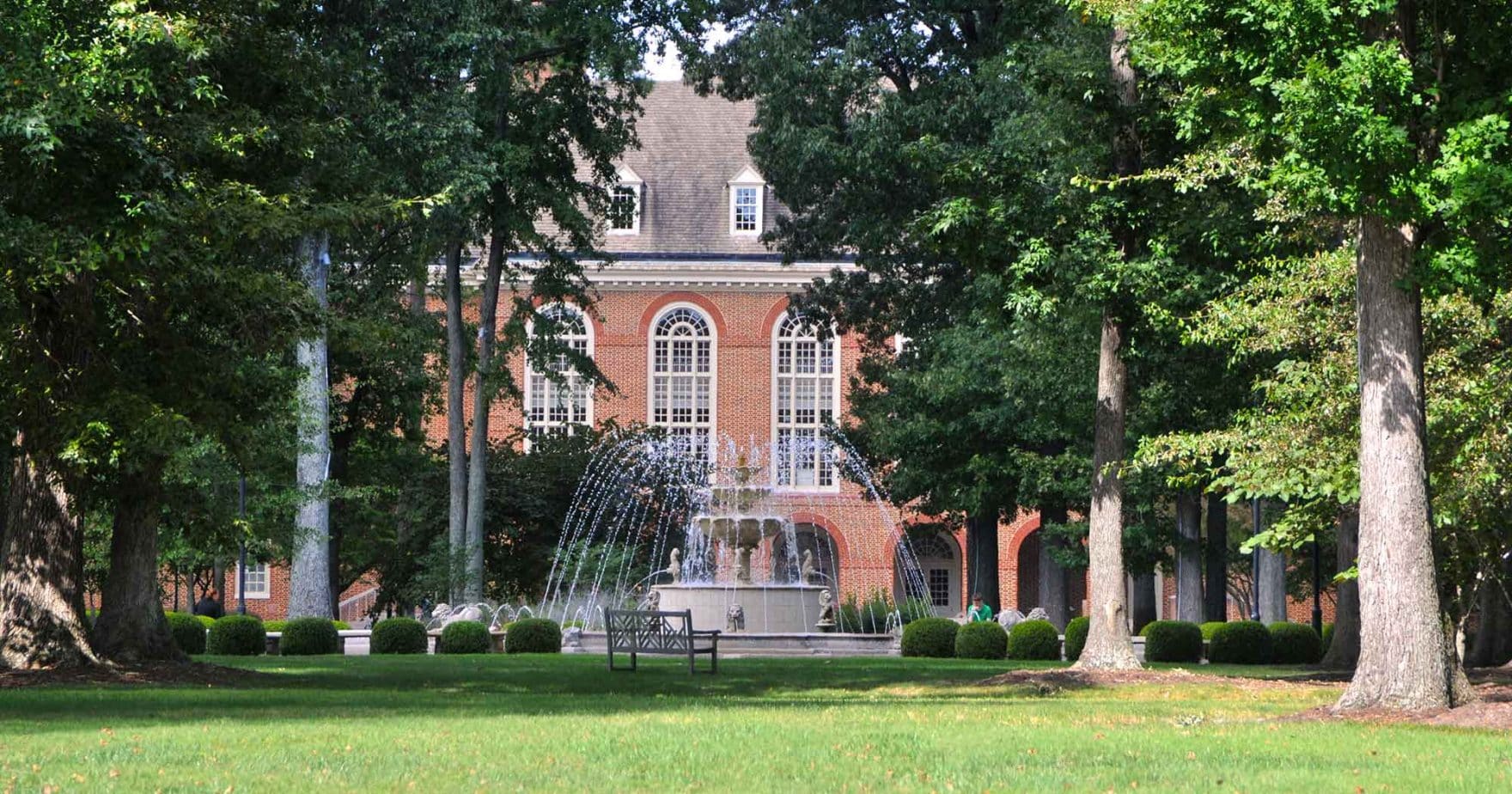 The fountain and library of Regent University Virginia Beach.