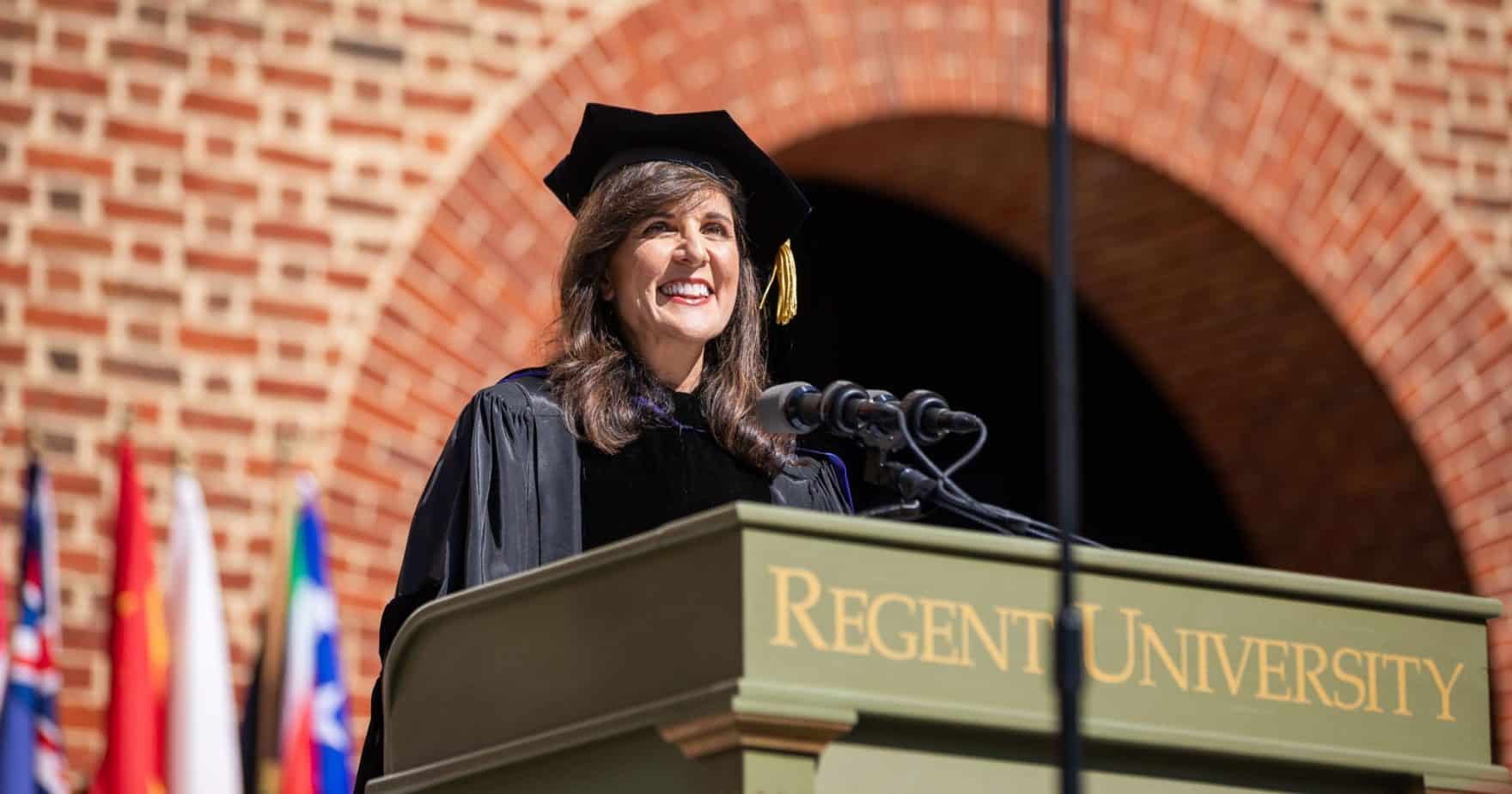 “You’ve received an extraordinary education.  Where other schools just fill your heads with facts, at best, this school devoted just as much time to filling your heart with faith,” asserted Ambassador Haley. “Your generation is the most important in American history.  What you do will decide whether our country slides downward, toward division and loss of purpose, or moves upward, together, in pursuit of our timeless promise…Remember that as you leave Regent University and enter the real world, you’re going to find that things are, well, crazy out there…The challenges facing our country are even bigger than you know. You might feel pressure to abandon your beliefs—but stand up for yourself.  Stand up for what’s right…As graduates of Regent University, you are uniquely ready to fulfill your calling. And I have faith you will help renew our country. Let’s do it together.”
