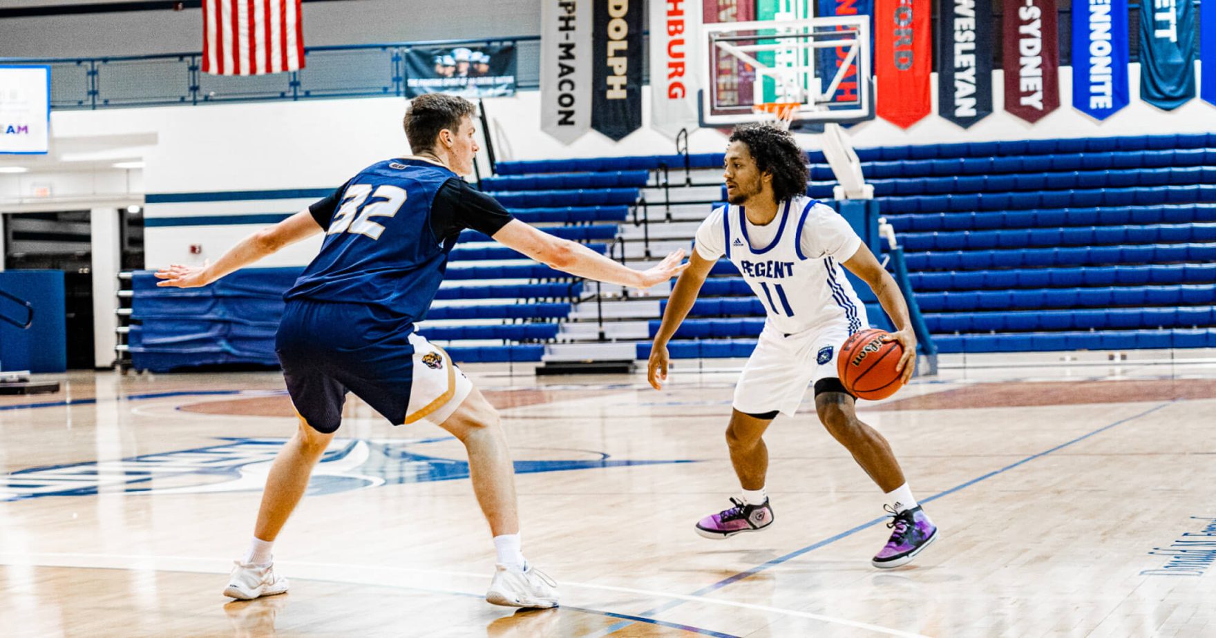 Regent University men's basketball player dribbling a basketball in a game with an opposing team defender in front, preparing for the new head coach Spencer Beaty.