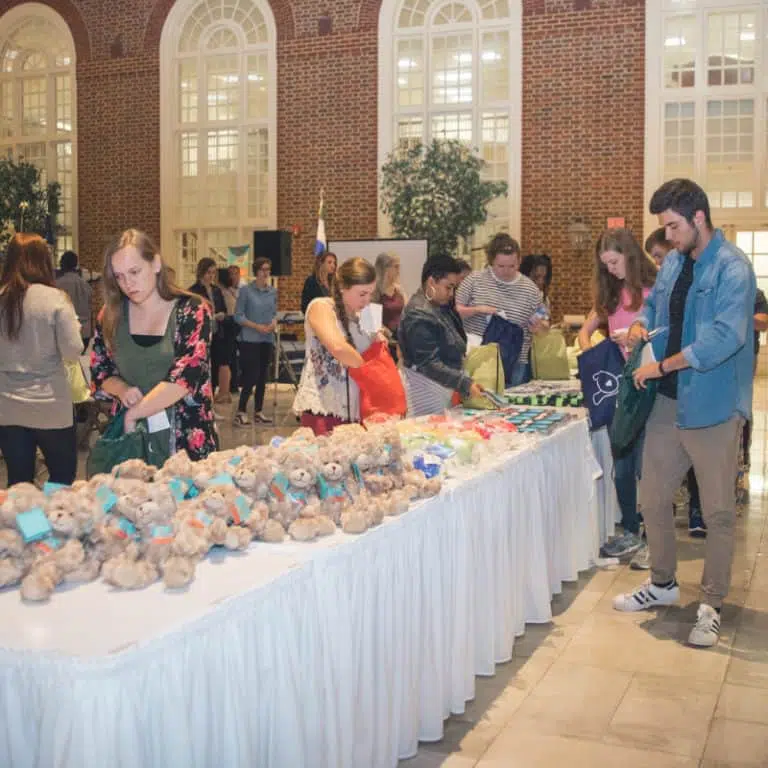 The event is an effort to educate college students about sexual assault as they package items like hairbrushes, clothes, toiletries, notes of encouragement and stuffed teddy bears for survivors of sexual assault.