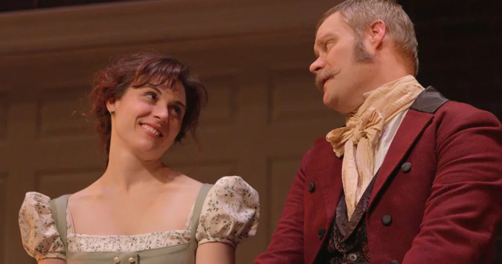 Two actors in Regency-era costumes performing a scene from Pride and Prejudice on stage, with the female actor smiling and the male actor looking at her mid-dialogue.
