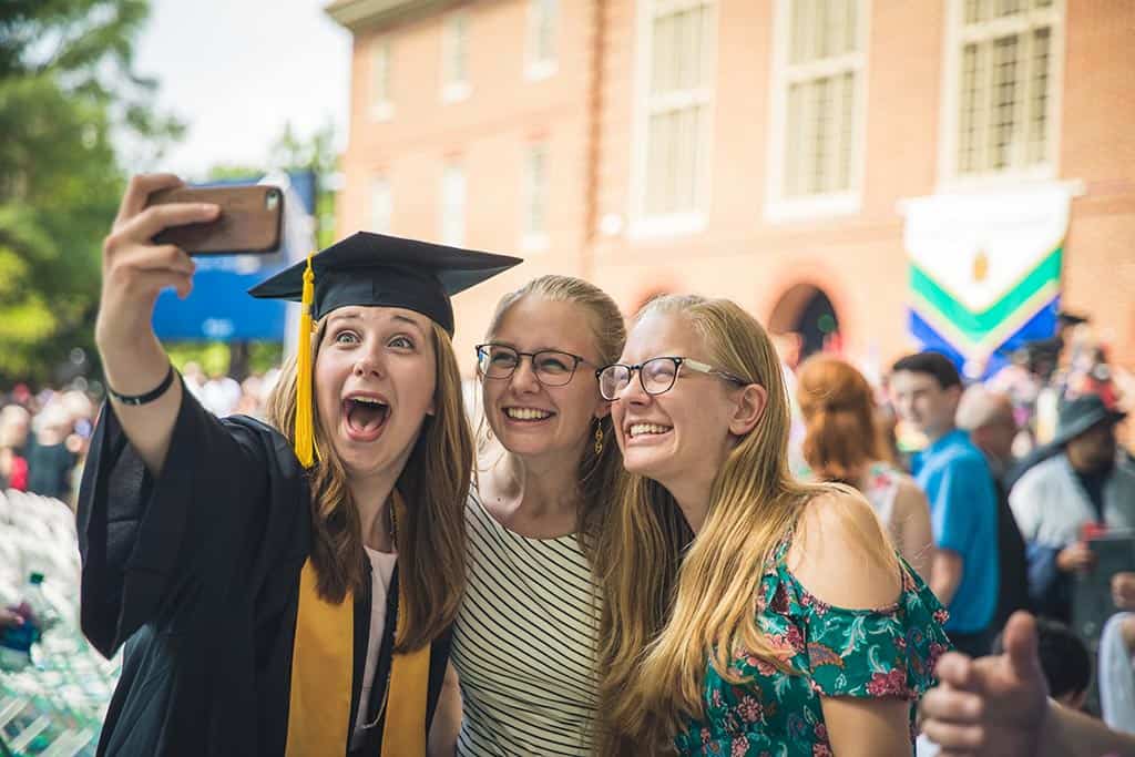 A sentimental 20-something College of Arts & Sciences graduate poses for a final selfie with her college roommates. “Say, ‘Pizza rolls and chocolate!’” they tease, in homage to the late-night menu that got them through finals.