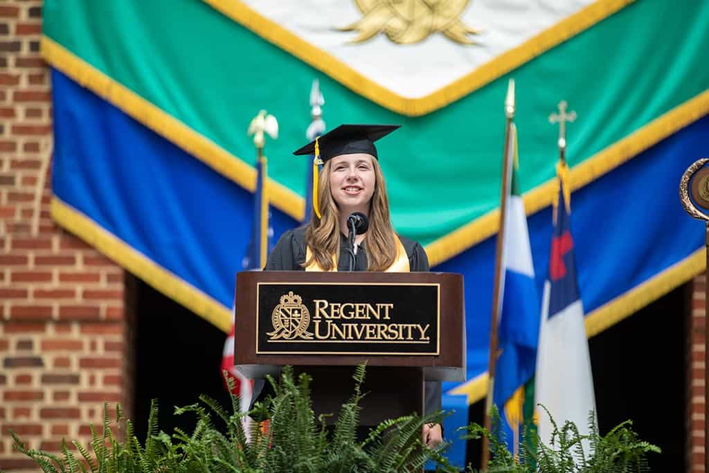 Chairman of Regent’s Board of Trustees Phil Walker took the stage next to commend the graduates for their hard work. Referencing Philippians 1:6, he encouraged them to embrace their roles as future leaders of communities, states and nations, being confident that “he who began a good work in you will carry it on to completion.”