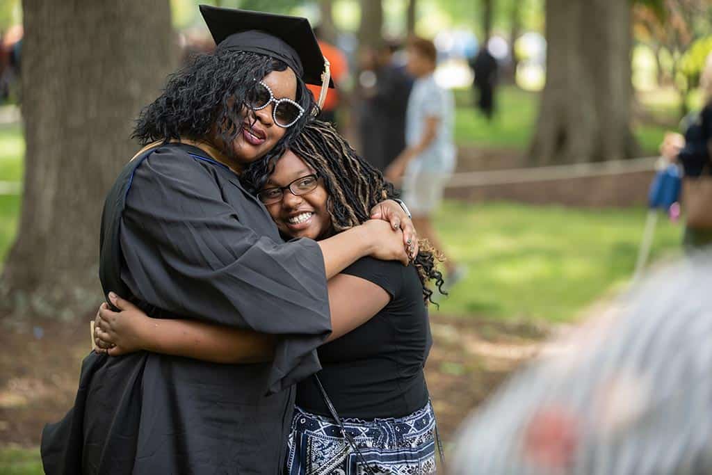 A School of Law graduate embraces his wife through tears of joy. “This is our degree,” he insists.