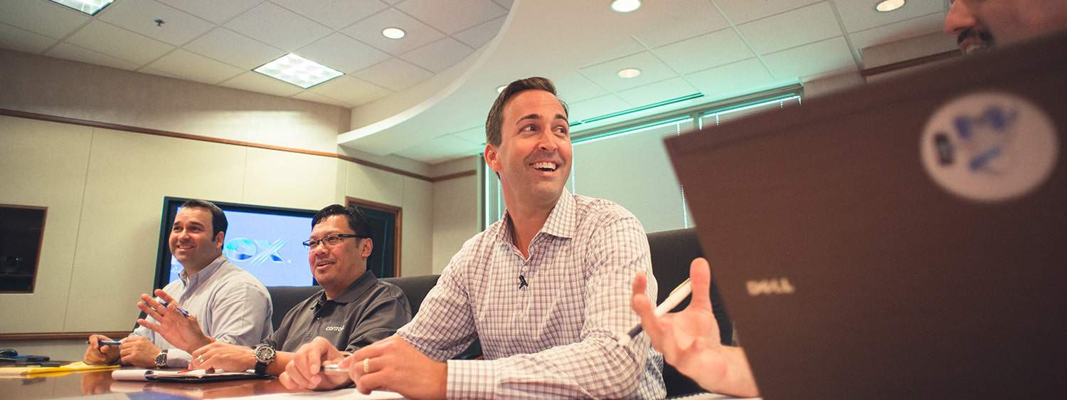 An alumnus at a meeting: Pursue your Ph.D. in Organizational Leadership online at Regent University.